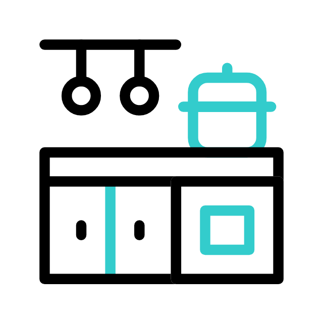 Cuisine, café, vaisselle, réfrigérateur, casiers de rangement et espace de détente à disposition.